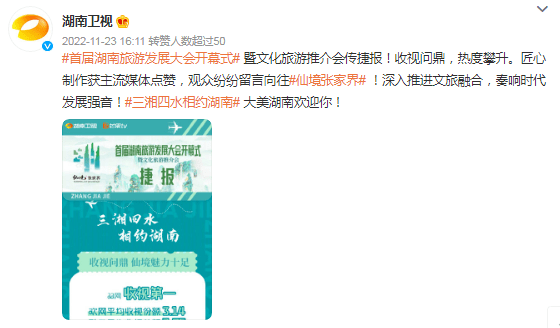去年11月份,湖南广电承办的《首届湖南旅游发展大会开幕式暨文化旅游推介会》在湖南卫视、芒果TV等平台播出,共有1.2亿受众收看了直播,节目在欢网、酷云同时段均排省级卫视第一名,相关短视频及话题触达人群超16亿人次。