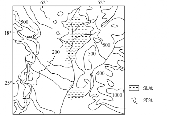(2023·全国·模拟预测)潘塔纳尔湿地位于巴拉圭盆地,是世界上面积最大的湿地。20世纪60年代以来,湿地周围高原台地被开垦的农田有成千上万亩,牧场的面积也在不断扩大。下图为潘塔纳尔湿地分布示意图。完成下面小题。