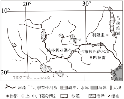 (2023·浙江·模拟预测)赞比西河(下图)两岸支流呈不对称发育。上游流经高原地区,水流缓慢,河道多弯曲,中游峡谷与平原相间分布,河道宽窄相间,下游河道宽阔,入海处形成巨大河口三角洲湿地。据此完成下面小题。