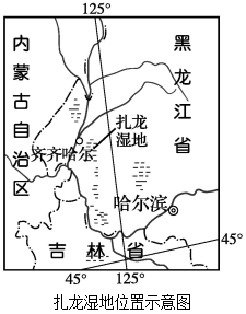 (2023·全国·模拟预测)位于乌裕尔河下游地区的扎龙国家级自然保护区内,河道纵横,湖泊星罗棋布,水质清澈、苇草肥美,沼泽湿地生态保持良好,被誉为禽鸟的“天然乐园”。黑龙江省政府将扎龙湿地自然保护区列为全省重点的保护对象。读图,完成下面小题。