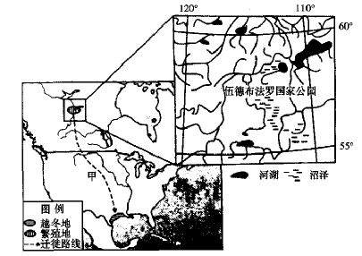 【分析】本题以美洲鹤迁徙路线图和伍德布法罗国家公园位置示意图为背景,涉及生物多样性减少、湿地的功能及其破坏的原因、美洲的自然环境等知识点,考查学生获取和解读地理信息、调动和运用地理知识的能力,培养其综合思维、区域认知的地理学科核心素养。
