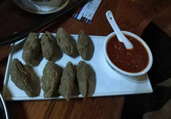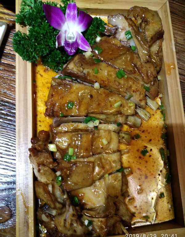 藏地调料不浓烈不炝口,容易被接受。大盘藏式烤羊肉来了。由于我们走的是新藏线进藏,一路吃了好多次烤羊肉,都是新疆风味。我不知道新疆烤羊肉的烤制工艺,多少知道一点是用生羊肉制作,所以口感有点干。对不吃肥肉的人来说,还有一点点柴。