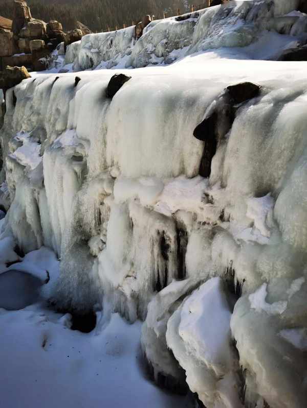 绕过照壁山,水流形成了一个小小冰瀑布,再往下就形成了一个小潭水,这里好像叫“太子湖”。水流被一个小径分开,有点日月潭的感觉啊。