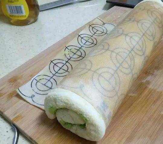 15、烤好以后倒扣放凉,趁蛋糕卷温热的时候卷起来定型。