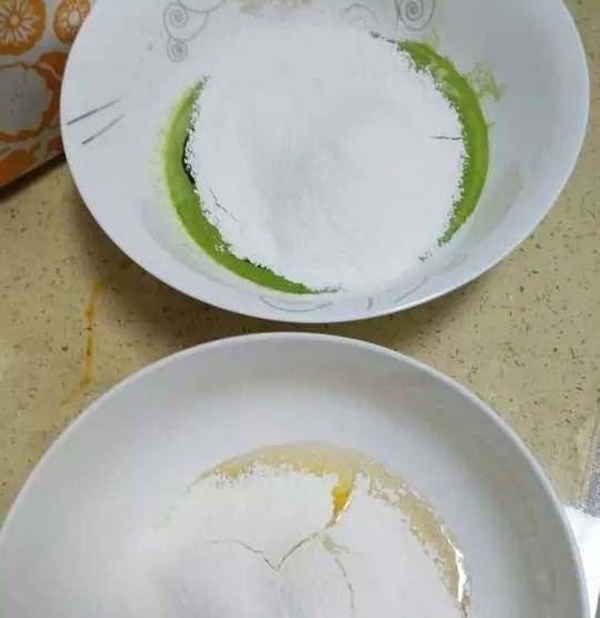 2、原味糊:三个鸡蛋黄放入大碗中,加入1g的香草精,20ml牛奶和15ml的玉米油。菠菜糊:两个鸡蛋,和菠菜汁,加入1g的香草精和15ml玉米油。
