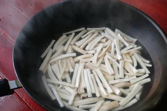 4.锅加水烧开,下入杏鲍菇焯水,将杏鲍菇焯水至变软