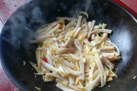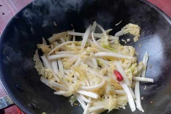 6.下入白菜,大火炒去水分,用中火煸炒至白菜稍变软