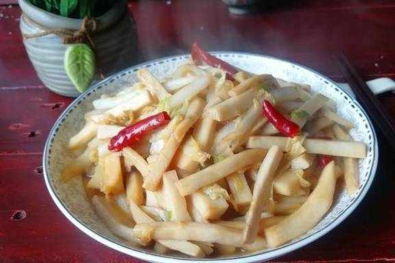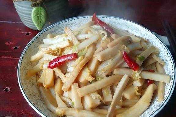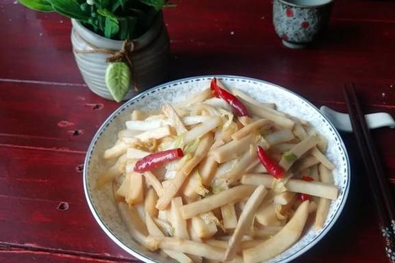 【白菜炒杏鲍菇】材料:白菜500克、杏鲍菇1个、油盐适量、葱1段、蚝油1汤匙、生抽酱油1汤匙、干辣椒4个