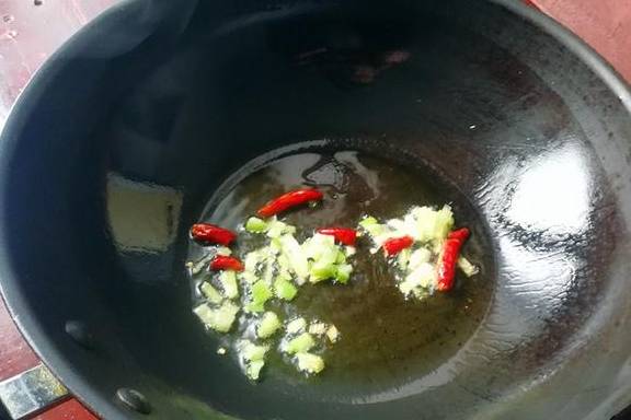 5.锅加油烧热,下入干辣椒段,葱花爆香