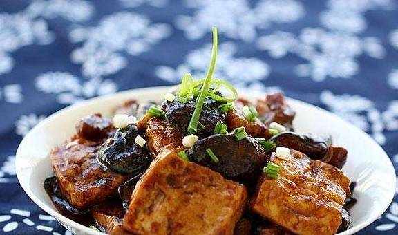 材料:豆腐1块、干香菇6朵(鲜香菇也可以)、青蒜(或蒜苗)3根。姜1小块、大葱1段、大料1粒、花椒8粒、桂皮1小段、老抽1/2小匙、生抽1大匙、蘑菇精、糖各1小匙、香油少许、盐适量。