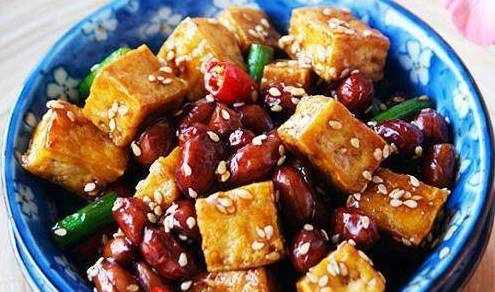 材料:豆腐250克、花生米一把、蒜薹丁适量(蒜薹切小丁)、花生油、糖、醋、酱油、料酒、盐、湿淀粉、鸡精、芝麻