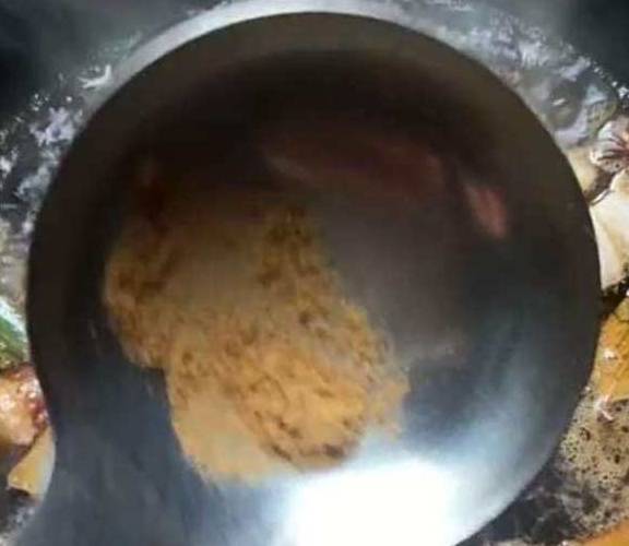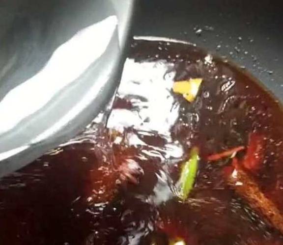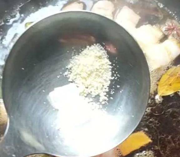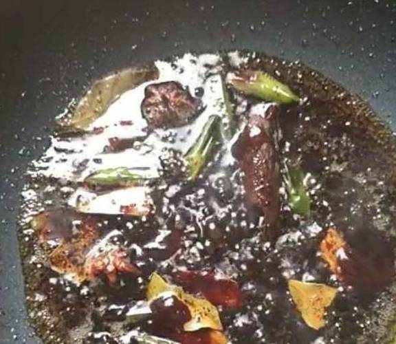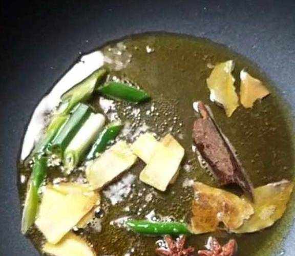 锅中加入油烧热,下入葱姜、香叶、桂皮、八角给炒香。