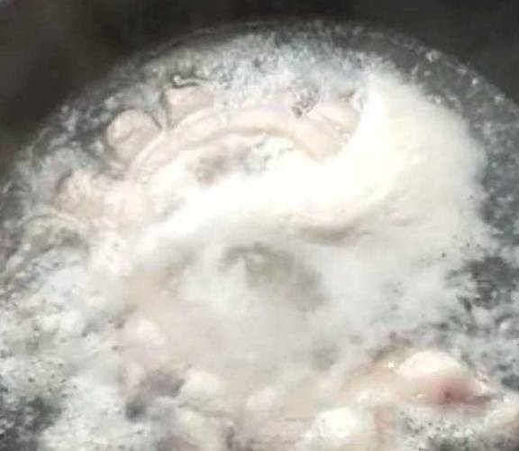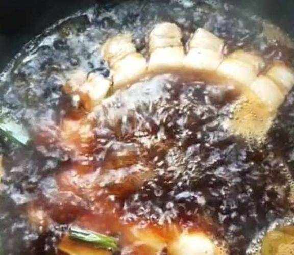 把五花肉下入锅中煮,大火煮开盖上锅盖,转小火煮上四十分钟。