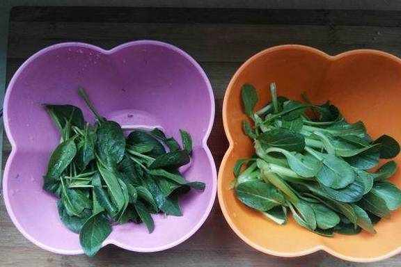 第一步:先备好蔬菜。在自己花园菜地里采摘了一些菠菜和小青菜,我自己种的,不打农药,不上化肥,当然是比较有机的。洗干净放好。