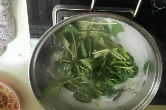 第四步:大约有一分钟左右时间,可以把菠菜和青菜下进锅里,搅翻一分钟;