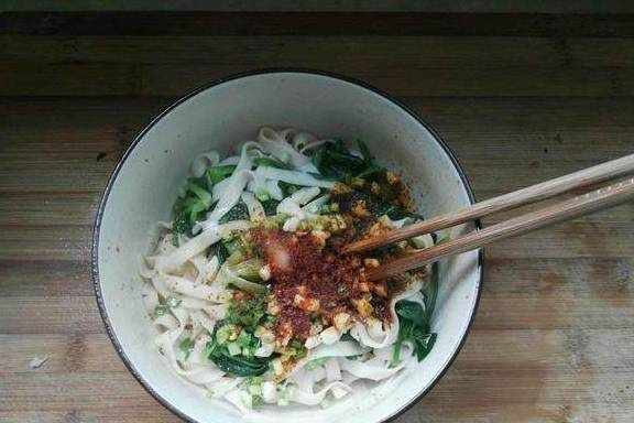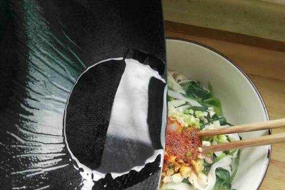 第七步:把热好的油泼在碗里的面上面,让辣椒面、盐和葱、蒜等食材的味道发挥出来;