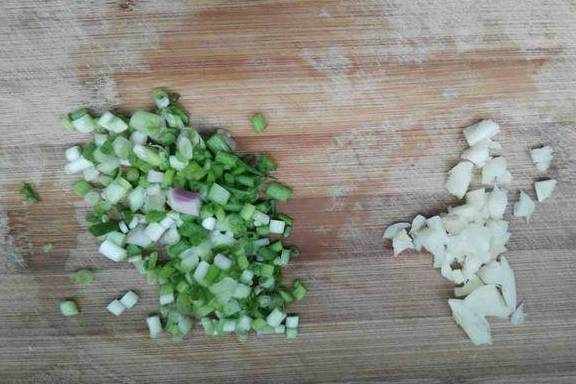 第二步:准备蒜末和葱末。把蒜切成碎末状,同时把葱叶喜好切成一节一节,尽量切细一些。