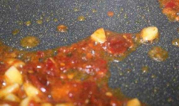 5、锅底留油,放入大蒜炒香,加入适量豆瓣酱翻炒出红油。