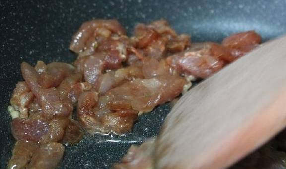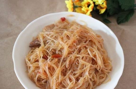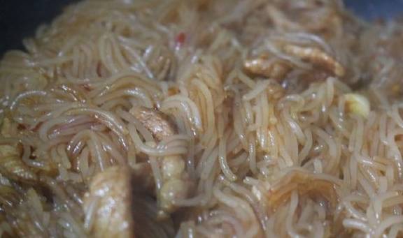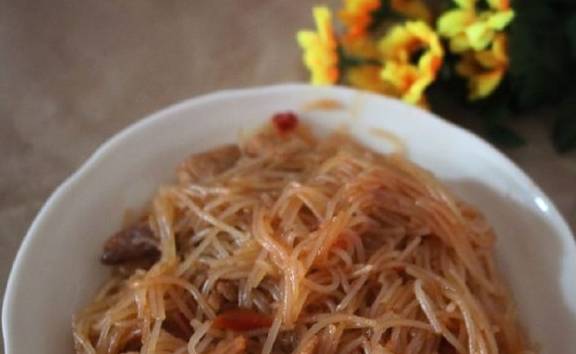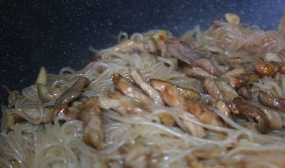 6、倒入肉丝翻炒均匀,倒入米粉开始翻炒。