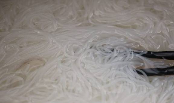 1、将干米粉煮上一滚至变软后,放入冷水中浸泡洗净后沥干水分。