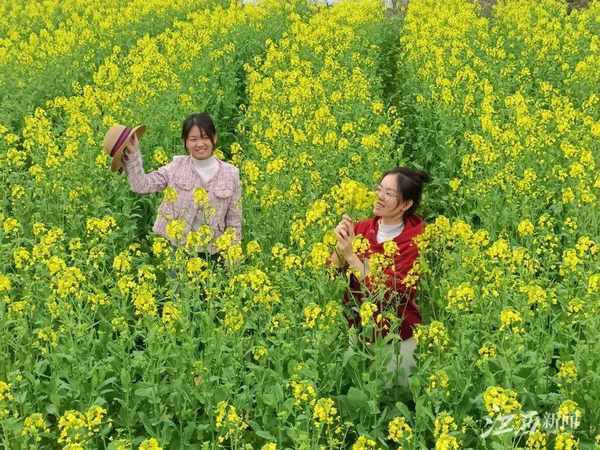 2月21日,赣州市于都县宽田乡上堡畲族村春光明媚,油菜花花开正艳,游客们在广袤乡野踏春赏景、拍照留念。