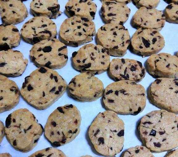 5、冻了两个小时之后,就在面包板上面用刀切成小片,放在油纸上面一个个摆好。就可以准备进烤箱啦!烤箱的温度时间:时间15分钟;上面温度150;下面温度160。