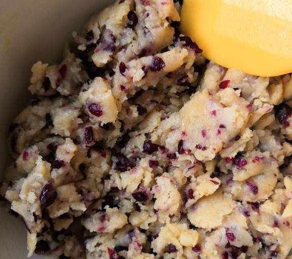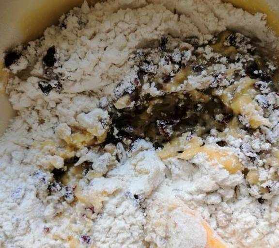 3、鸡蛋搅拌成功之后,将低筋面粉倒进去,搅拌匀称,然后将蔓越莓放进去,让蔓越莓均匀地分布在每一个面粉里面。