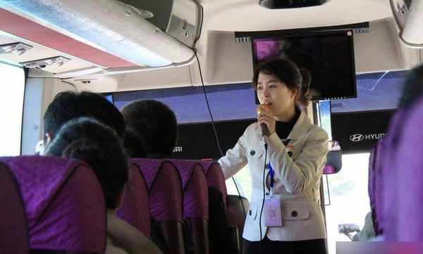 到达平壤就会有国外当地的导游接我们了,两个导游还有一个开大巴的司机,大巴车是从国外进口的,很宽敞舒适度很好,据说有些也是我们制造的。两个导游一男一女,女导游叫小丽,人是真的很漂亮打扮又富有气质,穿着一套职业装加半裙,腰上别着个小蜜蜂,人长得白皙细美身材又苗条,说话也是很温柔,讲着一口流利的中文,自从一看到我们就热情洋溢地欢迎,相当友好。