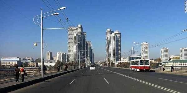 大巴车沿着平壤的宽阔大道行走基本没有堵车的,也是到了平壤我才发觉国外的农村和城市差异有多大。从新义州来到国外就经过农村地带,那里的路都是泥巴路,坑坑洼洼尘土飞扬,村里人赶着牛车载着货物行走,一群农民在田地里忙着耕种,火车经过时才会抬起头看一眼。