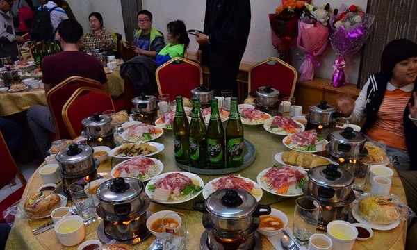 给我的感觉就是碗特别多,尤其是开城有一道铜碗宴,一下子就上十三个碗筷,桌上摆的满满当当的,有时还吃到朝式小火锅,每人一个火锅里面分有肉、鸡蛋、青菜调料等等,肉类多是猪肉和鸭肉,羊肉就少了,牛肉更是少,因为当地牛是耕作农是作为集体资产的,是用来生产不能私自宰杀的。青菜吃的也比较少,豆芽、土豆、玉米和蘑菇是比较常见。