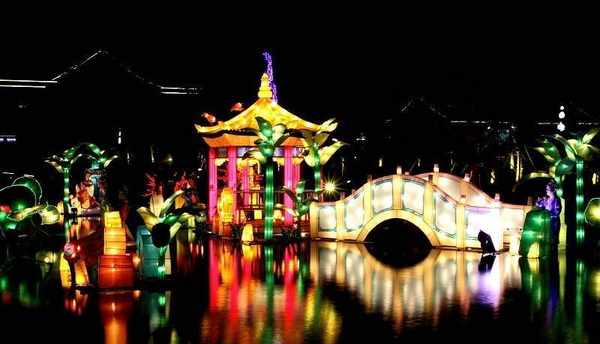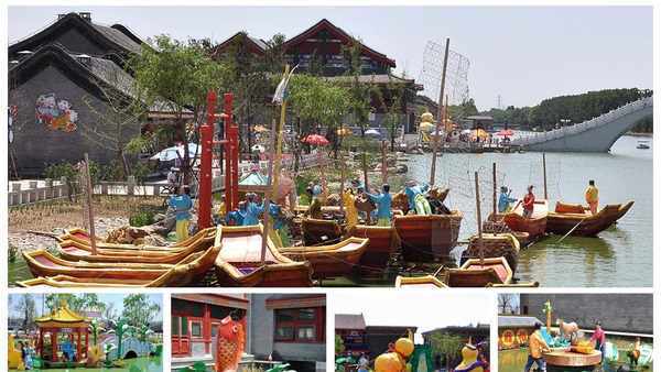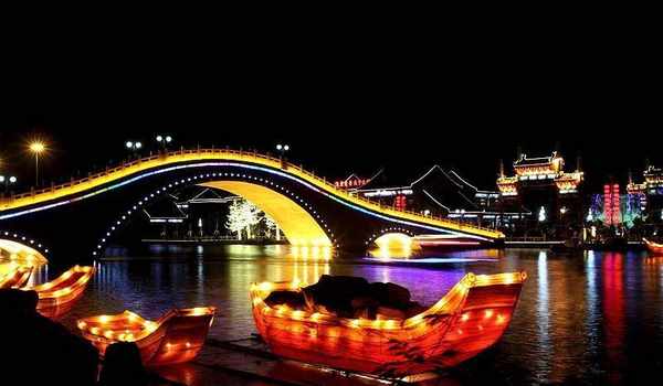 我独自背着相机,漫步在这仿古建筑中,不仅被街头高高的牌坊所仰慕,被街头巷尾的雕塑所吸引,还被根据神话传说和历史故事设置在水中的各种题材的既带有传统文化又具有地域文化的灯展所仰慕。