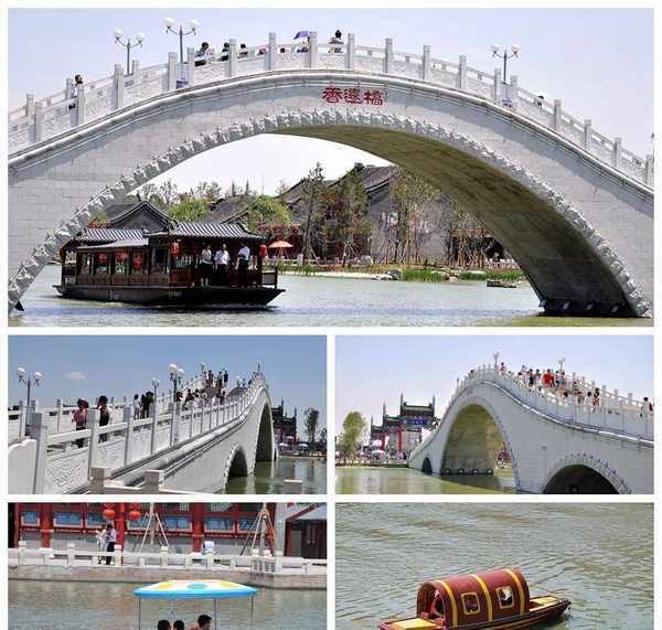 不宽也不窄的河道,清静干净的绿水碧波,既有载几十人的大船,也有一家三口的小舟,它们在河中游来漂去,让我心往神追;高耸清白的两座拱桥横跨在河上,犹如一道道彩虹。我想,如果是在晚上有灯火辉映,岂不是与秦淮河相媲美吗?