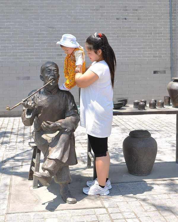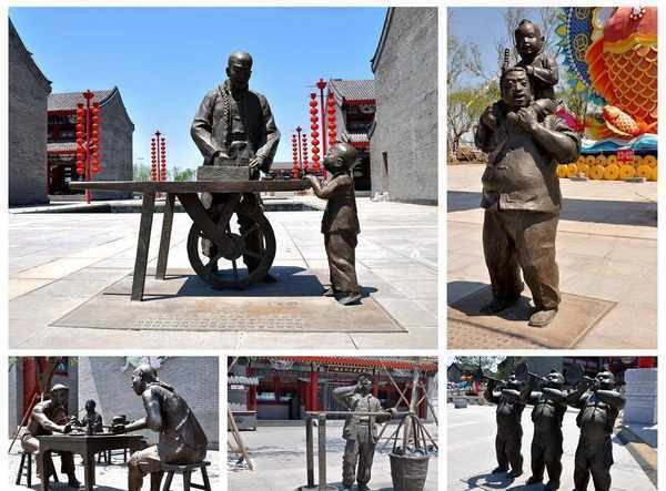 河的两岸是仿明清的建筑,既有矗立街头的牌坊,也有一层和二层的小楼,大都是商业用房,有用来用餐的,有用来品茶的,也有用来唱戏的,还有用来古玩字画展示的。将各地的特色小吃汇聚于此,将唐山传统的戏曲文化、茶文化和饮食文化融入其中,将名家书法画作在此荟萃此间,怎不让人流连忘返,陶醉其中。