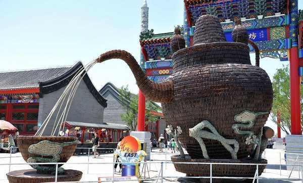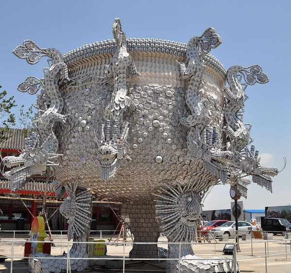 其实,我觉得,最吸引人眼球的,还是用医药玻璃瓶粘接的巨型大茶壶和用日用陶瓷镶嵌的巨型九龙鼎。