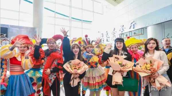 游客手捧鲜花与工作人员合影(央广网发 李花节主办方供图)