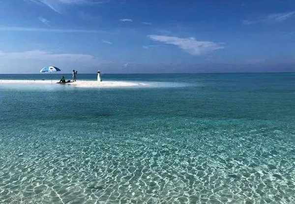 逛完全富岛之后,接着逛银屿岛。这里最大的特色就是海水很美,最远处是深蓝色的,然后一层一层在分层,以蓝色和绿色为主要色调,构成了一片迷人的七色海。虽然不是赤橙黄绿青蓝紫的七色彩虹色,但是却有着它独特的魅力。登岛后,旅游管家还会为大家拍集体合照留念,然后自由活动。