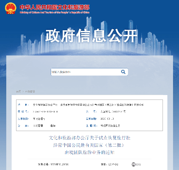 3月10日,文旅部办公厅发布最新通知。为进一步贯彻落实党中央、国务院决策部署,按照国务院联防联控机制外事组要求, 2023年3月15日起,试点恢复全国旅行社及在线旅游企业经营中国公民赴有关国家(第二批)出境团队旅游和“机票+酒店”业务。即日起,旅行社及在线旅游企业可开展产品发布、宣传推广等准备工作。