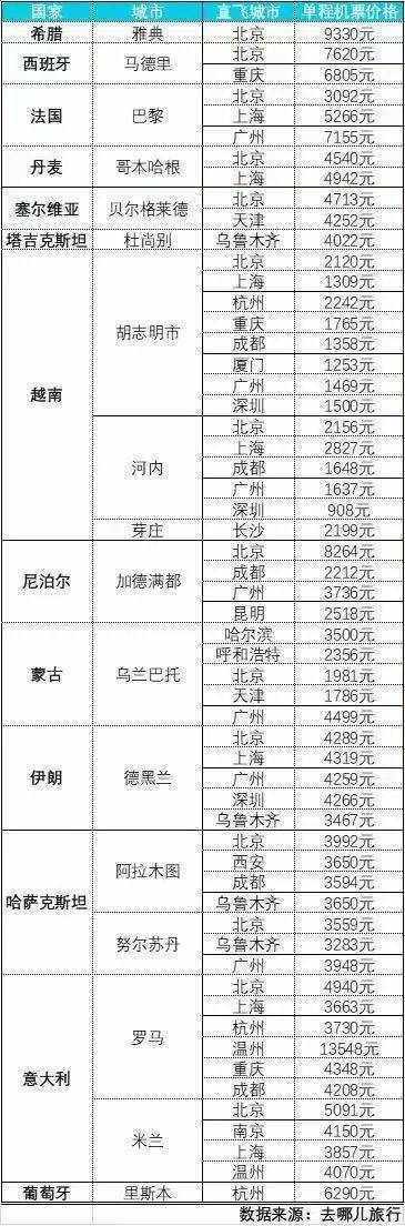 去哪儿数据显示,目前,中国飞往希腊、西班牙、法国、丹麦、塞尔维亚、塔吉克斯坦、越南、尼泊尔、蒙古、伊朗、哈萨克斯坦、意大利、葡萄牙等目的地均有直飞航班,其中飞往越南航班较多,机票价格较低,飞往欧洲国家机票价格依然较高。