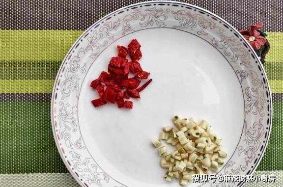 3、扁豆焯水的过程中,将备好的干辣椒和蒜瓣切碎,放在盘中待用。