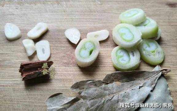 2、把准备好的葱花切成葱圈,再切点蒜片,准备一小块桂皮,两片香叶,放一边备用。