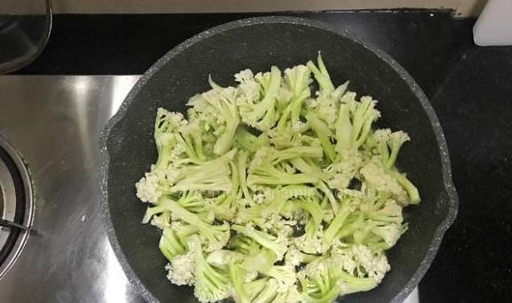8.然后将花菜倒进锅内,加入调味料,稍微翻炒就可以了