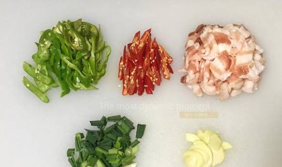 菜花300克、五花肉200克、柿子椒2个、小米椒5个、白皮蒜2瓣、蒜叶适量、食盐适量