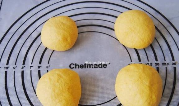 4,将面团平均分成四份,不用排气,烤箱开始上下管220度预热,把烤盘也一起放进去。