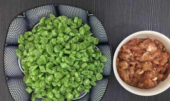 1、四季豆摘掉豆筋后,切成小粒;猪肉洗净剁成肉末,加入1汤匙酱油、少许淀粉、半勺盐腌制10分钟。小米椒切圈,大蒜切末。
