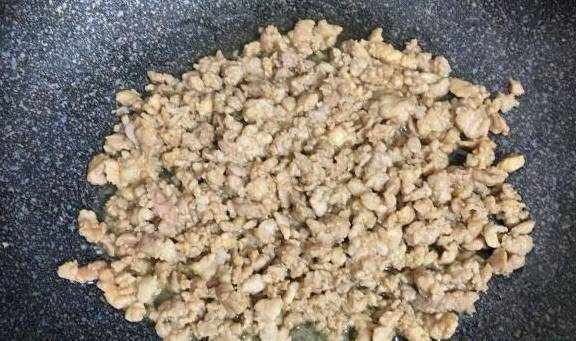 2、热锅放油,放入猪肉末煸炒变色,加半汤匙料酒去除腥味,然后盛出备用。