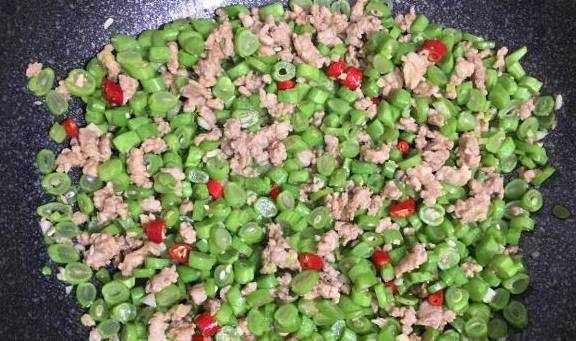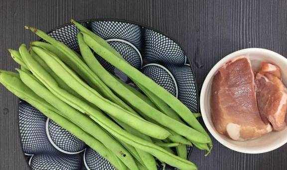 食材:四季豆250克、猪肉100克、小米椒3个、大蒜3个。