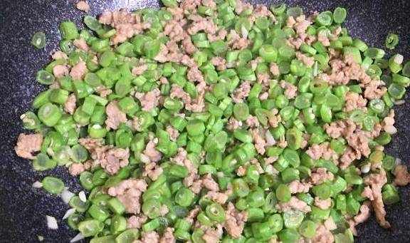 5、接着放入炒好的猪肉末,加半汤匙蚝油提鲜。期间可以加点水以免粘锅。