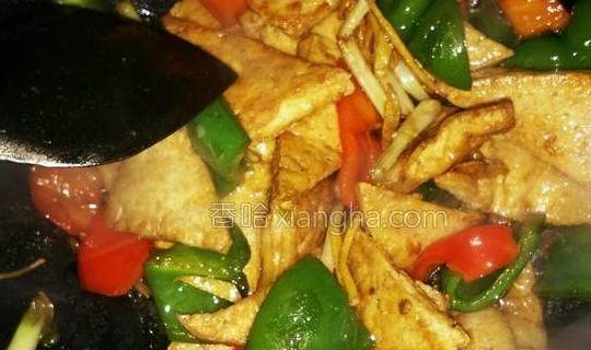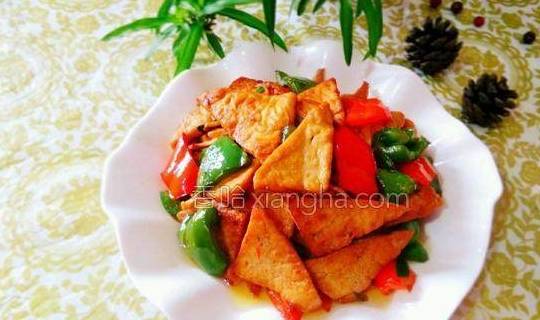 配料:老豆腐1块、青椒1个、红椒1个、葱段适量、姜适量、生抽适量、蚝油适量、料酒适量烹饪步骤:1.把豆腐切成三角形片状