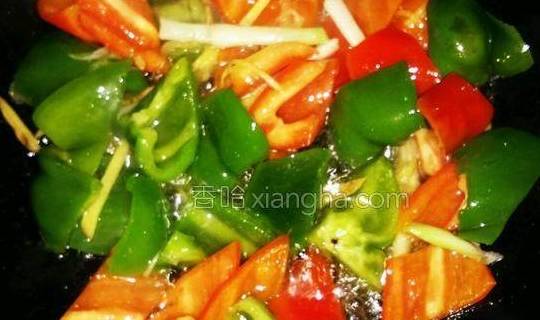 6.另起油锅,将姜,葱,青椒,红椒下锅翻炒出香味