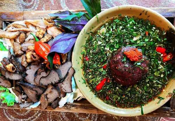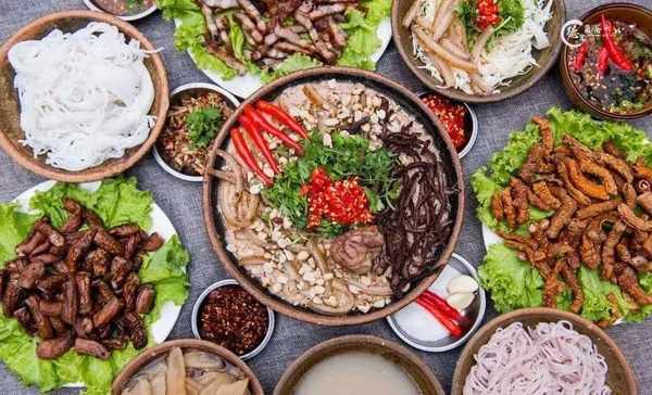 04景颇绿叶宴2018年3月,景颇绿叶宴被评为“我们菜”之云南十大主题名宴。绿叶宴是景颇山寨中既古朴又带点野性的名宴。以当地极为丰富的山菜和野味为主,采用传统的烤、煮、炸、腌等手法烹制,用肥大的树叶或芭蕉叶包盛饭菜,用树叶叠成勺、盆盛汤,因满席翠绿、全不用碗筷而得名。逐一打开“绿包”,你会收获“喷香的糯米饭、鲜美的鱼腥草、蜂蛹荷包蛋、飞蚂蚁煎饼、帕滚酸菜鱼”……到底先吃哪一个呢?
